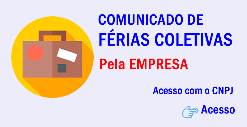 O comunicado de férias coletivas deverá ser protocolado através do site, pelo acesso acima, conforme o Caso, devendo serem primeiramente observadas as instruções contidas nas informações ao lado.